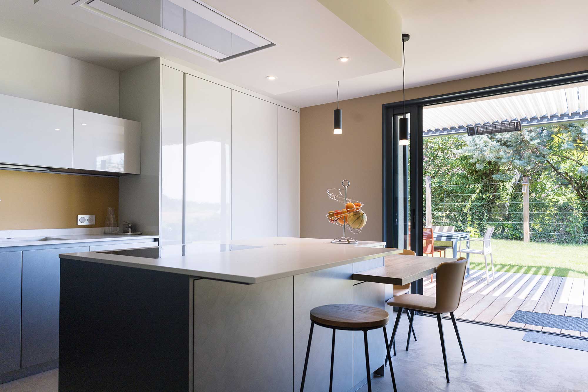 Une maison très communicante avec le jardin, et une composition graphique très sobre, matérialisée par une toiture plate.