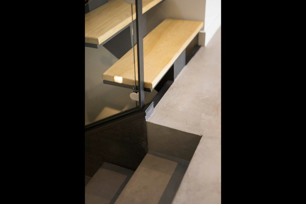 Une sensation de lumière et de transparence est renforcée par l’escalier majestueux tout d’acier et de verre et par la coursive en verre qui surplombe l’entrée, et dessert l’espace nuit à l’étage.