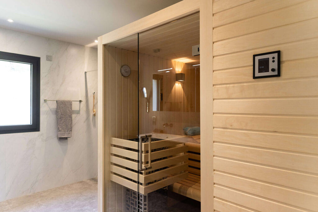 L’extérieur n’est pas en reste avec une piscine à débordement équipée de nage à contre-courant, et un pool house aménagé d’une kitchenette, d’une salle de bain et d’un 2° sauna.