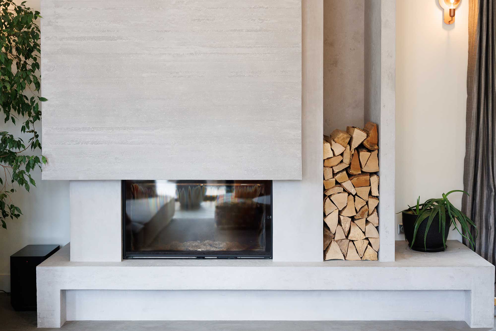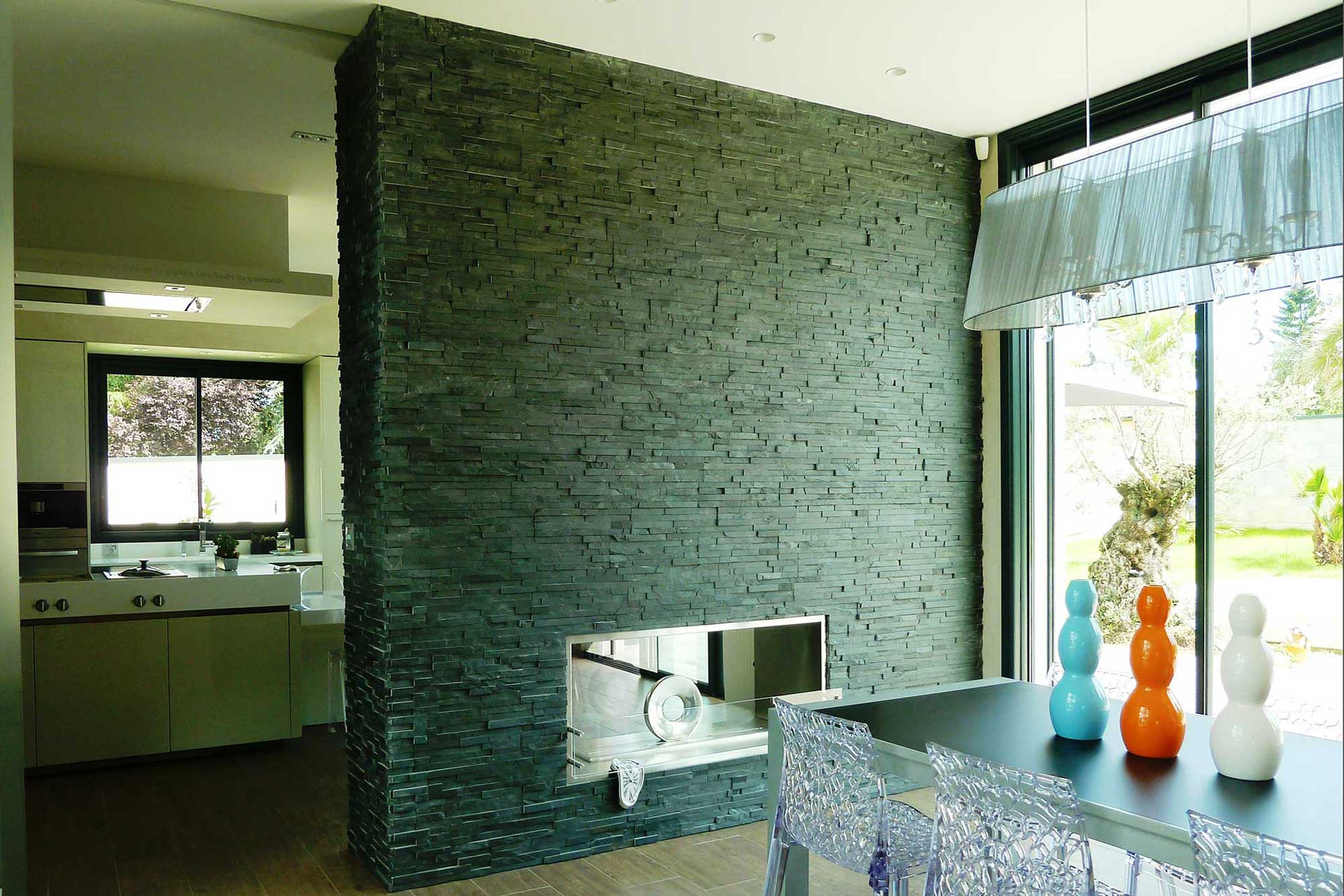La façade en pierres sèches s’allie parfaitement aux menuiseries alu. Le sol, les murs et la grande cheminée traités en béton apportent une touche plus moderne.