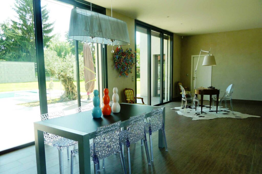 De très grandes ouvertures coulissant dans les galandages ouvrent complètement l’habitation sur l’extérieur et la piscine de nage. Les volets coulissants à lames habillent la façade.